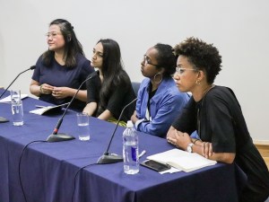 Panel 1: Against the Grain: addressing absence, creating narratives, messing the archives. Kajal Patel, Annie Kwan, Amal Al Haag with chair/discussant – Melanie Keen, Director of Iniva.