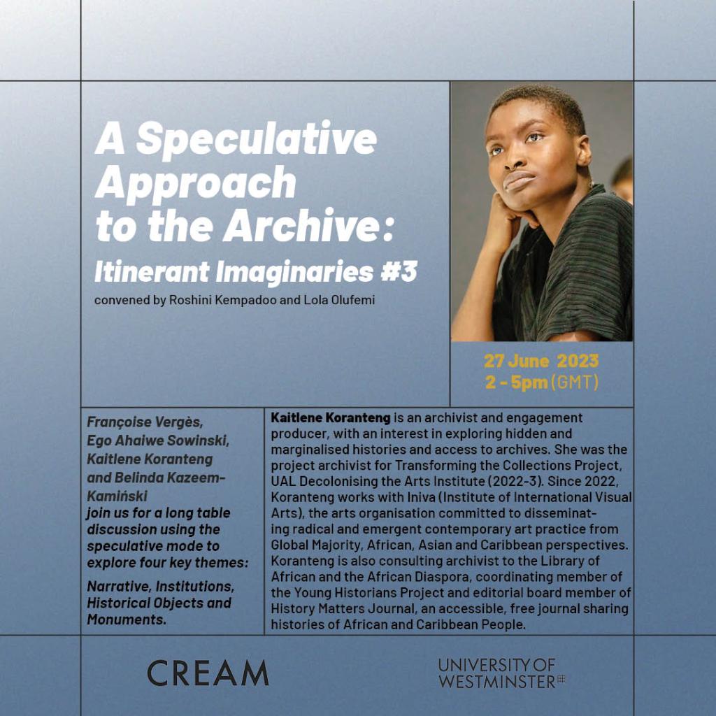 June 27th 2023 from 2 – 5pm, we are planning an afternoon entitled: A Speculative Approach to the Archive: Itinerant Imaginaries #3. Françoise Vergès, Ego Ahaiwe Sowinski, Kaitlene Koranteng and Belinda Kazeem-Kamiński join Roshini Kempadoo and Lola Olufemi for a long table discussion using the speculative mode to explore four key themes: